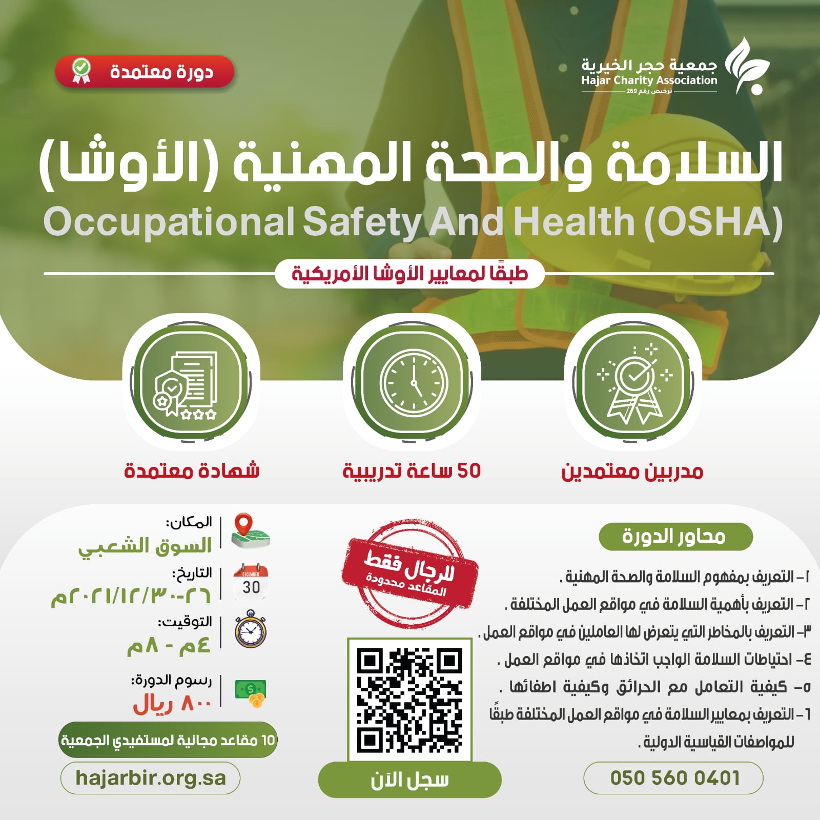 يسر #جمعية_حجر_الخيرية أن تعلن عن إقامة دورة السلامة والصحة المهنية #الاوشا